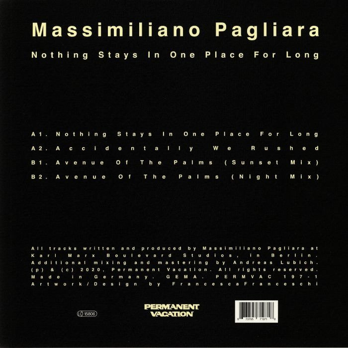 Massimiliano Pagliara is a true powerhouse! With his last album "Feel Live" under his chest, as well as an ep on Ostgut Ton (where he also holds a residency at the legendary Panormamabar) and a string of strong remixes, the trained dancer from Italy now presents his first full length ep for Permanent Vacation: "Nothing Stays In One Place For Long". The four tracks on the ep show the perfect symbiosis between man and machine (in this case a fleet of analog synths and drum machines) and offer the full spectrum of Massimiliano Pagliara's production skills from dubby, chord driven techno, to playful acid disco and blissful balearic house. Despite this wide range, he always keeps his trade mark sound that you can also find in his numerous dj sets around the globe merging a variety of people and styles for a happy dance under one roof.