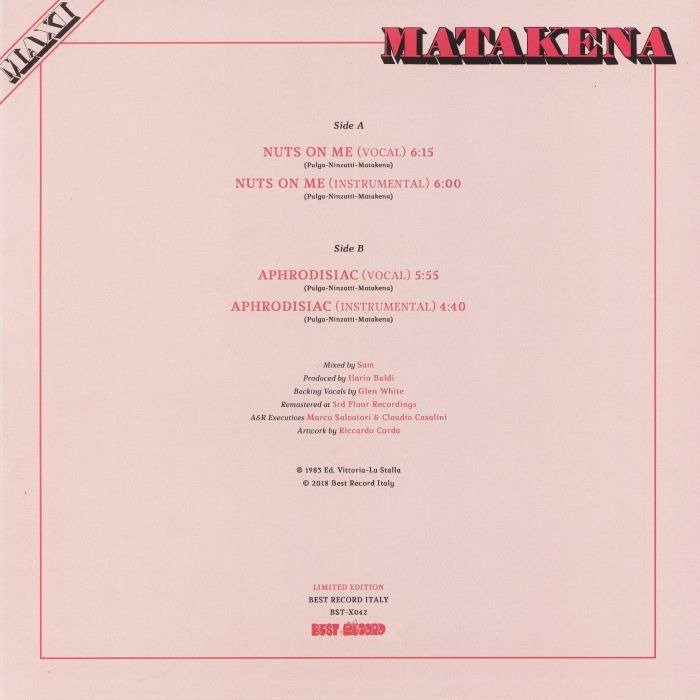From the team responsible for Kano and the evergreen Italo hit "I'm Ready," Matakena was a one-off release back in 1983 that has since gone on to attain true cult status (i.e. monstrous second hand prices). Thankfully, the trusted bastion of reissued Italian grooves Best Records is on hand to bring the music back to the people, digging the irrepressible funk of "Nuts On Me" and "Aphrodisiac" out of the vaults and pressing it up for a new generation to get down to. This is sleazy boogie par excellence, full of liquid synth bass, steamy vocals and grooves to die for.