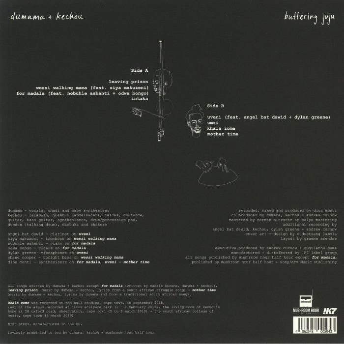 dumama (vocalist and uhadi player) + kechou (multiinstrumentalist with a focus on indigenous African instruments and handmade instruments) met in Cape Town in 2017. There was an instinctive pulse to the initial clutch of shows they played together, blowing open vast sonic and conceptual possibilities. "I guess we were in similar places with our music processes in trying to push healing music to the edges and be more experimental with it," says dumama. The narrative of the album unravels as a piece of magical realism informed by South African folklore and reality, detailing a woman's liberation story where the characters shift shape and traverse multiple realms, deploying various iterations of their power or lack thereof. "It has an organic, natural, cyber and modern kind of energy - all rooted in African aesthetics of sound and storytelling," says kechou. All of this sits on a bed of the duo's unique musical language, one that, although applied electronically in the form of looping and soundscaping, is founded on approaches to string, vocal and percussion tones that reflect a merger between Northern and Southern African heritage.