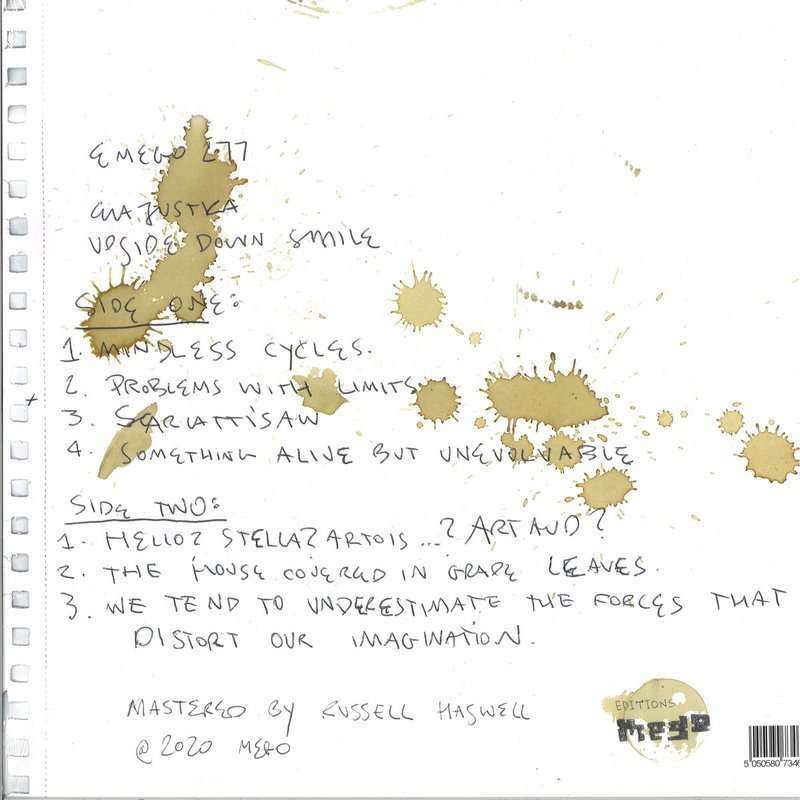 UPSIDE DOWN SMILE WAS RECORDED AND PRODUCED BY EWA JUSTKA AND BY SELF-DESIGNED, SELF-MADE, SELFSELFSELF, ODD LOOKING SLIGHTLY DYSFUNCTIONAL SYNTHESISERS AND BY A TRANCE PURPLE KILLER ROLAND JP8080 AND BY HIS BROTHER VIRUS AND SOME OTHER ROLAND BROTHERS NO SISTERS INCLUDED DURING THE TIME WHEN EWA JUSTKA WHO CURRENTLY LIVES IN GLASGOW, GOVANHILL, ALLISON STREET, WHERE RECENTLY HER PASSPORT WAS STOLEN DUE TO THE BURGLARY, WHERE SHE LIVES IN JOY, ALTHOUGH SOMETIMES THE FLOOR GETS WET DUE TO THE LEAKING WINDOWS AND SOMETIMES ONE CAN FIND DEAD PIGEONS LAYING ON THE STAIRCASE BUT IT'S NICE AND COSY AND EWA JUSTKA HIGHLY INFLUENTIAL PERSON IN THE DEEP DARK TRANSISTOR LADDER CIRCUITS LIVES SINCE SHE IS STUDYING PHD AT EDINBURGH COLLEGE OF ART WHERE SHE THINKS A LOT ABOUT IMITATION IN SYNTHESISER DESIGN AND FILTERS AND VCOS AND FORMANTS AND ACID AND HARDCORE MUSIC AND TWIN T FILTERS AND OPERATIONAL AMPLIFIERS AND SHE TURNS KNOBS AND THINKS AND THE UPSIDE DOWN SMILE ALBUM WAS MADE IN THE DEPTH OF THOSE THOUGHTS QUITE OFTEN SAD THOUGHTS UPSIDE DOWN SMILE IS A BIT OF A CYNICAL SMILE BUT AN HONEST SMILE CYNICAL BUT HONEST UPSIDE DOWN SMILE IS A SMILE THROUGH TEARS BUT TEARS OF JOY SCOTTISH JOY UPSIDE DOWN SMILE IS UPSIDE DOWN ACID ONE COULD SAY UPSIDE DOWN SMILE COULD BE INTERPRETED AS A SAD SMILE BUT IT IS A SMILE IN THE END OF THE DAY.