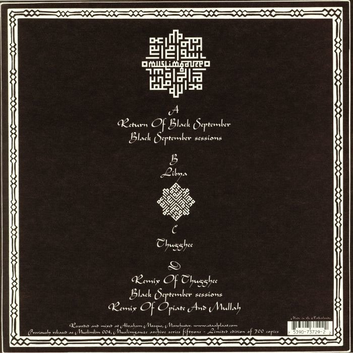 First released in limited numbers on CD back in 1996, "Return of Black September" remains one of the late Bryn Jones AKA Muslimgauze's most celebrated and notorious releases. Here it finally gets a release on wax, with the original album being stretched across two slabs of wax with the addition of two archival recordings produced by Jones during the same period (they're both simply named 'Black September Sessions'). It's a superb set all told, with the sadly departed producer mixing and matching dark ambient tones, spaced-out field recordings, Middle Eastern percussion, mind-altering dub effects and more forthright IDM rhythms to typically inspired and off-kilter effect.