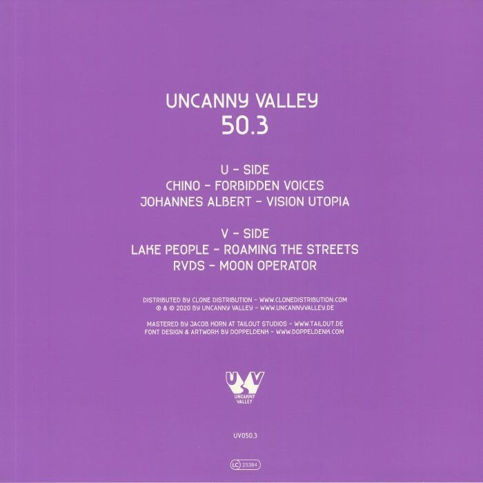 After Brexit, we thought it would be a brave attempt to snatch the Queen's interpretational sovereignty over the colour purple. So, we have named our new record just like that. Of course, this is only half the truth, as we named all six other UV050 compilation records after colours as well. The purple one, this one right here, is the second to last, completely with the wonderful artwork by Leipzig's Doppeldenk and four tracks to dance your ass off to. Krakow's Chino shows us how to balance perfectly between straightforward urgency and mystic playfulness. His acidic FORBIDDEN VOICES sports just the right amount of chaos to make you go crazy on the dancefloor. Being a spiritual brother for a long time, it's actually the first time Berliner Johannes Albert releases on Uncanny Valley with his VISION UTOPIA, a subtle House bomb, that pushes just the right buttons to trigger your desire to escape into cosmos. Also from Berlin comes Lake People, who does what he does best with ROAMING THE STREETS: A subtle and razor-sharp track that points out that good dance music can sweeten your life everywhere, not only in the club. Finally, RVDS, one of Hamburg's finest, blesses us with MOON OPERATOR, a deep and masterful dive into sonic sceneries that no one has ever listened to before. Except of course for your expert friends, who claim to have heard even the most obscure dreamy Acid track.