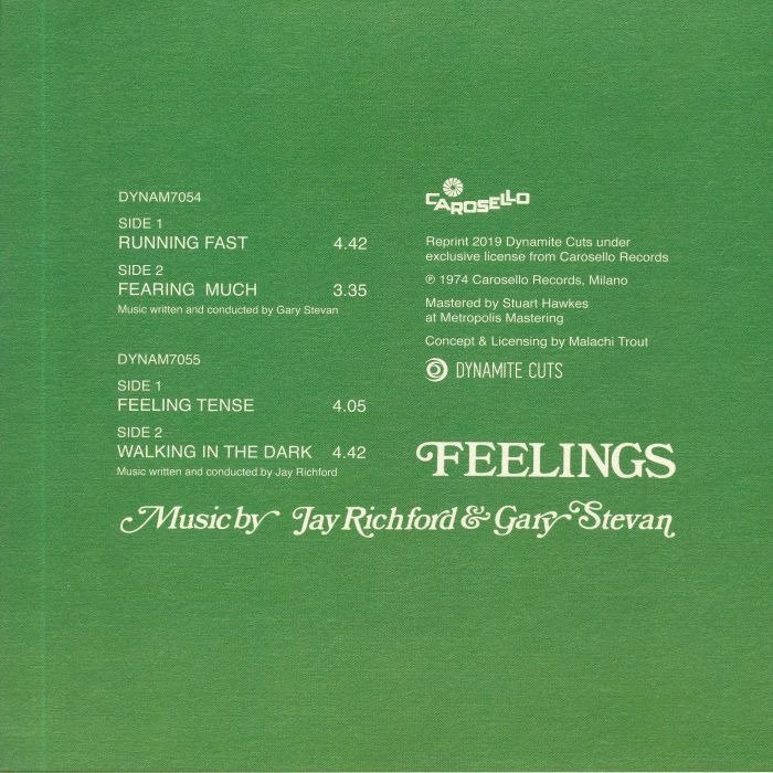 It seems so obvious you wonder why it doesn't happen more often: Stefano Torossi's "Feelings" album from 2000 was made up of track titles that convey certain situations and emotions that he masterfully reflects in the music. This new double 7" includes the highlights, such as the racing jazz and trumpet stabs of "Running Fast," the sustained and uneasy chords of "Fearing Much" and "Feeling Tense," which is actually a pretty lush bit of smooth jazz. "Walking In The Dark" rounds off the double pack with playful guitars and luxuriant synths that are pure soundtrack goodness. Ace.