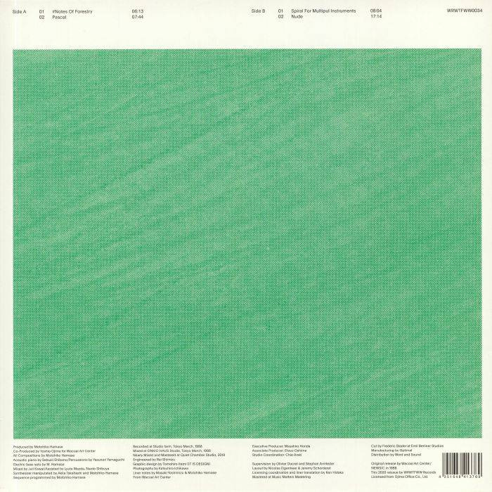 WRWTFWW Records is excited to announce the official reissue of Motohiko Hamase’s remarkable ambient/environmental/minimalism project #Notes of Forestry, available for the first time since 1988. The album is sourced from original masters and available on vinyl and CD with liner notes from the artist. This marks the third release from the ESPLANADE SERIES which focuses on the works of Yoshio Ojima, Motohiko Hamase and Satsuki Shibano. One of the most fascinating and peculiar works from the golden era of Japanese ambient, #Notes of Forestry was initially released in 1988 by Newsic, the cult label started by Tokyo’s Wacoal Art Center (also known as Spiral), home, notably, of Yoshio Ojima who co-produced the album. Conceived by Jazz bassist turned experimentalist Motohiko Hamase, the magnum opus offers an enchanting mix of free-form pastoral electronics, otherworldly percussions by Yasunori Yamaguchi, and delightfully allusive piano played by none other than Satsuki Shibano (Sound Process’ Wave Notation 3). Vibrant, sometimes eerie, and absolutely captivating, #Forestry captures Hamase’s quest for musical freedom, he explains: “Inside the body of a musician, music is always transcendentally resonating. More than language, music reigns. When creating music overlaps with the moment my body performs, I strive to be as close as possible to the feeling of musical freedom. I feel that this notion lies at the foundation of this album". Musical freedom, here, provides an essential escape, extending the path uncovered by pivotal releases such as Midori Takada’s Through The Looking Glass, Satoshi Ashikawa’s Still Way, and Yutaka Hiros’s Nova. #Notes of Forestry is reissued in conjunction with Motohiko Hamase’s Technodrome and Anecdote albums ...
