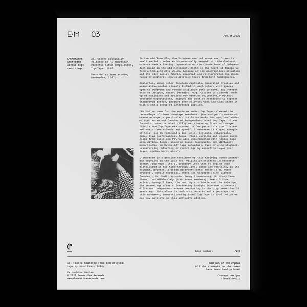 L’Embrasse is a compilation originally released in 1987, less than 50 copies were distributed at the time through local shops and it is a portrayal of a unique and very little known scene, generated in the deep underground milieu of Amsterdam. None of the tracks presented on this album has ever been re-released after the ultra-limited original edition on cassette format appeared.