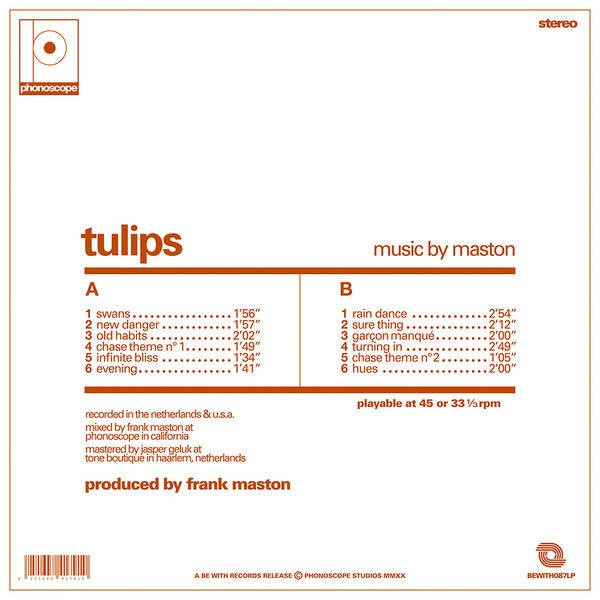 Frank Maston’s Tulips is a sample-ready film score to the best 70s movie never made. Originally a super-limited self-release on his Phonoscope label in late 2017, Tulips has already become incredibly sought-after. Be With were introduced to Maston by mutual friends Aquarium Drunkard and it didn’t take long before we decided this modern classic deserved a reissue.