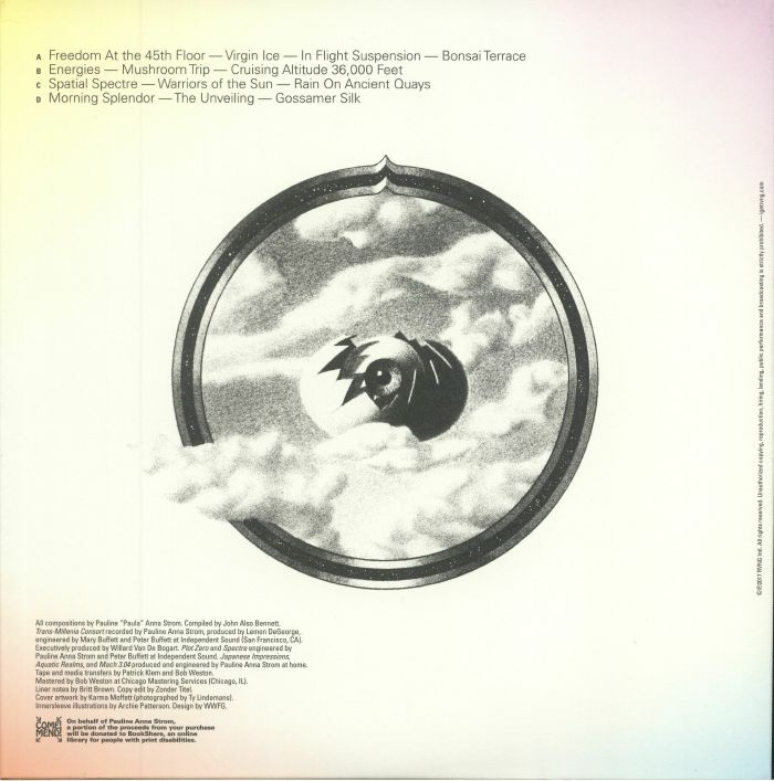 Otherworldly and anomalous, hushed and hallucinatory, Pauline Anna Strom’s unique style of inner space music reaches across time to futures and pasts far from our own. Trans-Millenia Music compiles eighty minutes of Strom’s most evocative work, composed and recorded between 1982 and 1988, for the first authorized overview of the enigmatic Bay Area composer. Pauline Anna Strom introduced her music to the world in 1982 with Trans-Millenia Consort, a collection of transportive synthesizer music providing listeners a vessel to break beyond temporal limits into a world of pulsing, mercurial tonalities and charged, embryonic waveforms. Strom’s solicitation into the unknown continued through a half dozen more stellar releases during the decade, which, despite their singularity and mastery, slipped into the more obscure annals of want lists and bootleg editions. Though Strom’s work developed during the dawn of San Francisco’s influential new age and ambient scenes, her music remains non-programmatic, an adventurous tangent diverting from the era’s ideological tropes. The artist’s own path to creative maturation was atypical. Raised by her Catholic family in Louisiana and Kentucky, she was tragically deprived of sight due to complications from a premature birth. This impairment would sensitize her to listenable worlds with great acuity and creative engagement, the loss becoming a formative aspect of Strom’s spiritualist take on the power of music. Recalling her youth, Strom says she was “a loner and heretic.” Seeking solace and solidarity, she moved to the mecca of California’s counter culture with her husband, a G.I., who was assigned duty in the Bay Area during the decline of the Vietnam War. Having dabbled with piano as a teen, Pauline’s passion for music reignited when synthesizers became central to the serene scene of San Fran FM radio in the mid-70s. Inspired by the electronic music of the instrument’s early ambassadors (Klaus Schulze, Brian Eno, Tangerine Dream), Strom purchased a Tascam 4-track recorder and a small array of synths (Yamaha DX7, TX816, CS-10) to navigate her own universe of space music. As she gained confidence to share her creations beyond the walls of the apartment where she meticulously crafted under headphones day and night, Strom took on the artistic identity of the ‘consort,’ spiriting listeners through epochs described by her evocative musical passages. From this moment and represented within Trans-Millenia Music, Strom proves to be a delicate melodist and meticulous colorist, as well as a sound designer of great drama and inspired energy. The celestial sounds evoke the uncertainty of pre-physical and primordial elements, creating an impression of a world beyond access that Strom has always felt was hers. In the collection’s liner notes Strom recounts, “I have always been in touch with the past more than the present.” Apart from its mysteries, Strom’s curiosity for the non-present was also suffused with a social bent. She believed that humanity was confined by its inability to access the people of the future, therefore suffering in a kind of group solipsism. Designing a world of music that rooted itself in all times but the present, Strom’s alter ego, the Trans-Millenia Consort, became a musical activist for triggering this state of heightened consciousness. Exemplary passages highlighted in Trans-Millenia Music were selected from the three full-lengths originally issued on vinyl in addition to a group of four full-lengths self-released on cassette. This substantive body of work challenges the canonization of new age and ambient music as one-size-fits-all categories. Strom’s music induces a dynamic range of listening that captivates and intrigues, a cinematic experience rather than a meditation for passive listening. An open invitation to earlier worlds and a trans-temporal philosophy for living, Pauline Anna Strom’s Trans-Millenia Musicis available originally November 10, 2017 on double LP, Vinyl edition feature original artwork by visionary Karma Moffett, printed inner sleeves and booklet with extensive liner notes scribed by Britt Brown.