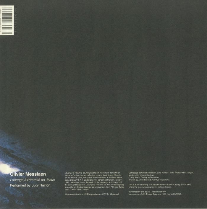 Louange à l'éternité de Jésus is the fifth movement for cello and piano from Olivier Messiaen's Quatuor pour la fin du temps (Quartet for the End of Time), adapted here for cello and organ. It was composed while Messiaen was a prisoner of war in Stalag VIII-A, Görlitz, Germany, and first performed with other detained musicians inside the Nazi camp in January 1941. Inspired by the Book of Revelation, this music invokes the composers vision of "immutable peace", in its infinitely slow, ecstatic pacing and metre, described by the pianist Steven Osborne as “seeming to touch the far edges of human experience, subverting the idea of linear time”.