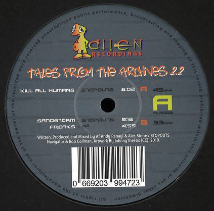 Alien Recordings was born in the late 80's by Andy Panayi and Alec Stone, out of a love of music and DJing. They also ran a night around London called Alienation, playing a mix of house, electro, breakbeat and techno. They're back as (An) Alien with new material for your listening pleasure; alongside music by legend Terry Francis as well as Panayi and Stone themselves (A²), the likes of Stopouts (Rob Collman + Navigator) were staples of the imprint and they front up for "Tales From The Archives Part 2.2". There's the brooding Drexciyan electro funk of "Kill All Humans" originally from 1998, a remastered version of "Sandstorm" from their release on Robin Ball's Groovepressure imprint in 1999 and on the B side is the underwater cybernetic epic "Freaks" by A².