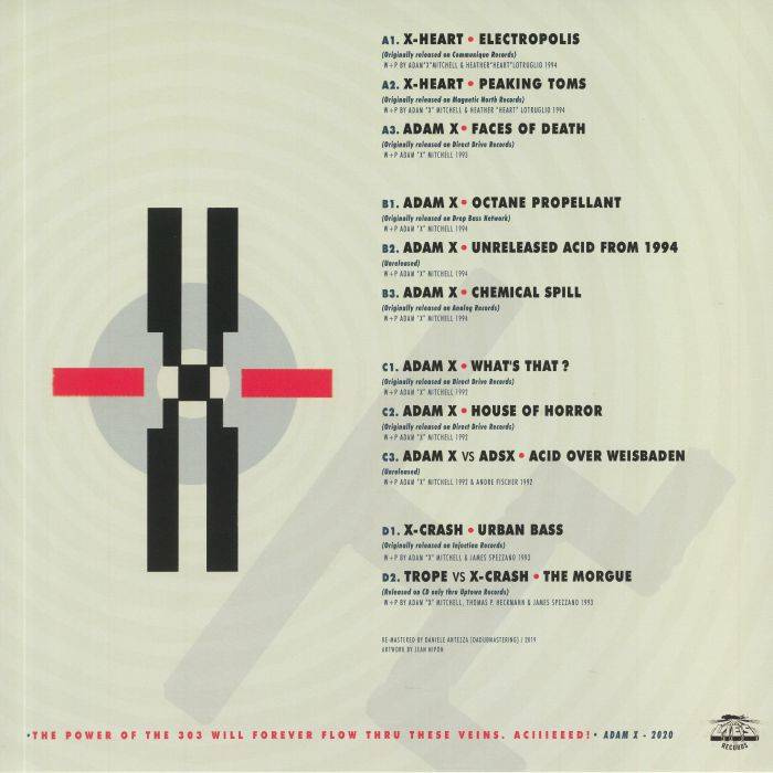 During the early '90s, Adam 'X' Mitchell - brother of the more celebrated breakbeat techno producer Frankie Bones - made some of the most intense, mind-altering and rave-igniting techno on the planet. For proof, check this killer compilation of material he released (under a variety of aliases) between 1992 and '94.It puts wild, intense, brain-melting TB-303 acid lines right at the heart of the action, variously wrapping them around jacking drums ('Faces of Death',' Octane Propellant'), body-contorting electro beats ('Electropolis'), and breathlessly pounding Teutonic techno rhythms ('Acid Over Wiesbaden'). If you like your techno to sound psychedelic, ragged, aggressive and unfeasibly heavy, then you need this in your life.