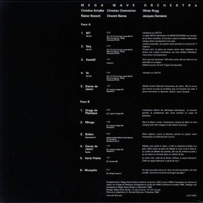 Libreville Records is proud to present a focus on legendary electronic swiss project Mega Wave Orchestra in the form of a compilation LP including unreleased material.Originally released privately in Geneva in 1988 as a box set containing five LPs by The Mega Wave Orchestra and five prints by the artist H. Richard Reimann. The Mega Wave Orchestra, the brain-child of musician, mathematician and composer Christian Oestreicher, was conceived as an multi-media electronic music big-band. It was comprised of seven multi-instrumentalists Christine Schaller, Vincent Barras, Jacques Demierre, Olivier Rogg, Rainer Boesch, Roger Baudet, and Benoit Corboz, with Oestreicher as arranger and producer.The Mega Wave Orchestra created a new hybrid music. It was a music with roots in the jazz and classical traditions, but one which also drew on the sonic freedom of musique concrete and the kind of total experience offered by psychedelia. The diverse backgrounds and specialisms of each of the band leaders/writers resulted in a wide variety of music across the five discs: from austere drones and granular aural detail to warm oddball fusion and gorgeous but cracked vocal jazz. There are useful contemporary comparisons to be made: zoned synth jazz like the Azimuth LP on ECM or Karin Krog’s Freestyle; Larry Heard’s sequencer dreamtime; the Valium minimalism of Pep Llopis or Jun Fukamaki; Dexter Wansel’s shimmering arrangements for Loose Ends, or even the FM sheen meets cold war threat of Donald Fagen’s Night Fly. Here, too, is the sound of music technology about to snowball and define its own aesthetic, unknowingly prefiguring auteurish bedroom producers like Black Dog or The Detroit Escalator Company.Lovely crafted tip-on sleeve. Remastered from Master tapes. 600 copies.