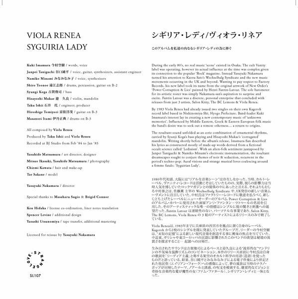 Strangelove is proud to present the first ever reissue of 'Syguira Lady', an eerie and absorbing ride through the rich imagination of enigmatic Osaka group Viola Renea. While riding the current interest in Japanese music, the album remains an anomaly to much of the local music of the time. Juxtaposing ancient/modern sources of sonic inspiration, North England's new musical movements collide with Eastern European folk rhythms, while oriental scales slide amongst wavey-electronic instrumentation. The resultant musical dreamscapes sought to conjure themes of noir & seduction, recurrent in the period's techno-pop. Kuki Imamura described the album as the sound of unknown memories with aural visions & strange musical loves coalescing around a femme fatale; 'Syguirian Lady'.