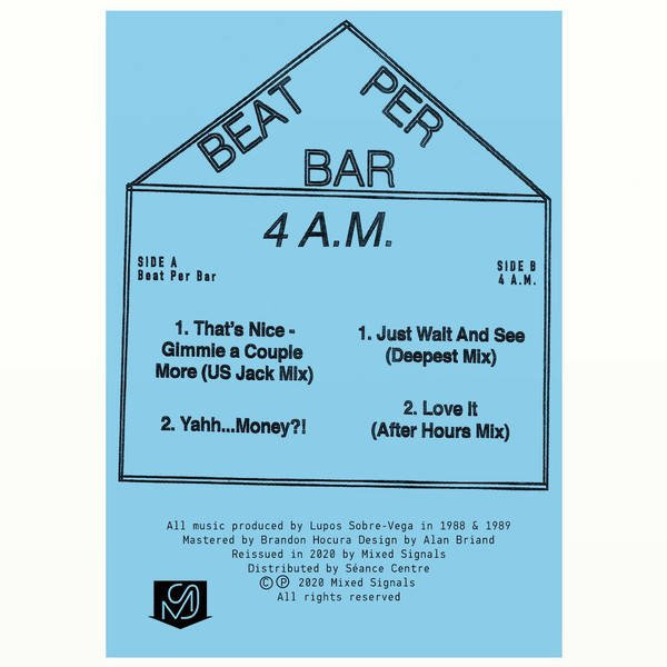 Under the pseudonyms 4 A.M. and Beat Per Bar, Lupos Sobre-Vega released two eccentric 12”s, of what, in retrospect, can be called vernacular house music. Both records are individualistic collisions of New Wave, Bass, Freestyle, Hi-NRG, Acid, and Sample House recorded in Sobre-Vega’s home studio in Orange County, Los Angeles. Using a Yamaha QX-5, Roland S-50, his mom's Roland Juno 60, EMU drum machines, and Yamaha DX-7, he put his nascent jazz chops to use and laid down the idiosyncratic dance tracks that he would self-release on his own label, House Hold Records, in 1988 and 1989 respectively. Although both 12”s were credited to groups, Sobre-Vega confirms that “the so-called band members were club friends. A couple were models and actors, or just plain good ol’ dancers. They were strategically picked by me, of course. So yeah, 4 A.M. and BEAT PER BAR are 300% me. There is no other.”