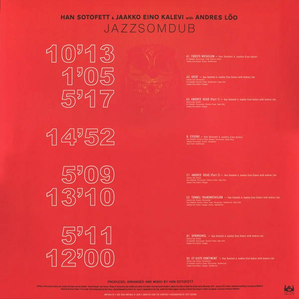 Finnish multi instrumentalist Jaakko Eino Kalevi & Norwegian producer Han Sotofett (aka DJ Sotofett) teamed up with Estonian drummer Andres Lõo on the "Jazzsomdub" album for a wide & improvised excursion within a narrow world of drums, percussion, saxophone, flutes, electric piano, monophonic synths and tape delays. Besides distinctively exploring Lõo and Kalevi's batterie & percussion work with deep-listening quality drum mixes there are elements of impulsive beauty, particularly on "Essens" free carrying sax solo. The album partly reaches for well known directions of jazz in the vain of the cosmic, psychedelic, improvised, atonal and spiritual, but the particularness lies within the rhythm & mix – like a rubber band stretched in 4 dimensions.