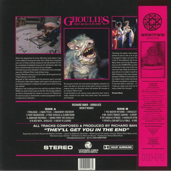 WRWTFWW Records is ghoulishly happy to announce the first everl release of Richard Band’s full uncut soundtrack for cult horror comedy classic Ghoulies (1985).The limited edition pink-colored 180g vinyl LP is housed in a heavy gatefold sleeve with full movie gallery, obi strip, and video store stickers.The album is also available on CD house in a classic jewel case with cavalier and video store sticker. Both versions contain liner notes by Richard Band himself.