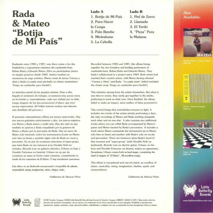 Recorded between 1985 and 1987, this album brings together the two founders and leading performers of candombe-beat, Ruben Rada and Eduardo Mateo. They hadn´t collaborated in a project since 1969. Both artists had reached their creative prime, with Mateo having released “Cuerpo y Alma” and Rada, “La yapla mata” (which included the classic song ‘Tengo un candombe para Gardel’). 140 gram vinyl with OBI & Insert
