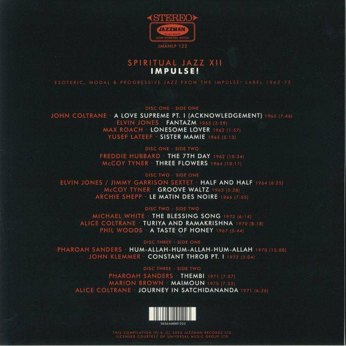 It would be fair to say that the latest instalment of Jazzman's popular Spiritual Jazz compilation series is one of its biggest yet. Stretched across three slabs of wax, it sees the label's dusty-fingered diggers raid the bulging back catalogue of one of jazz music's most important and celebrated labels of the '60s and '70s, Impulse!. It opens with 'Part One: Acknowledgement' from John Coltrane's brilliant A Love Supreme album and ends with Alice Coltrane's wonderfully exotic 'Journey In Satchidanada'; in between, you'll find essential slabs of cosmic and spiritual brilliance from such legends of the sound as Archie Shepp, Max Roach, Yusuf Lateef, Freddie Hubbard and Pharoah Sanders, as well as a handful of lesser-celebrated players.