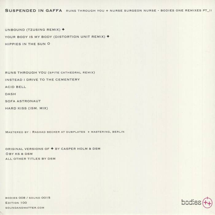 Suspended In Gaffa finally returns with new material on this Mini-LP that also holds remixes from Tzusing (L.I.E.S / Bedouin / PAN), Spite Cathedral, Ism. and new Swedish act Distortion Unit.