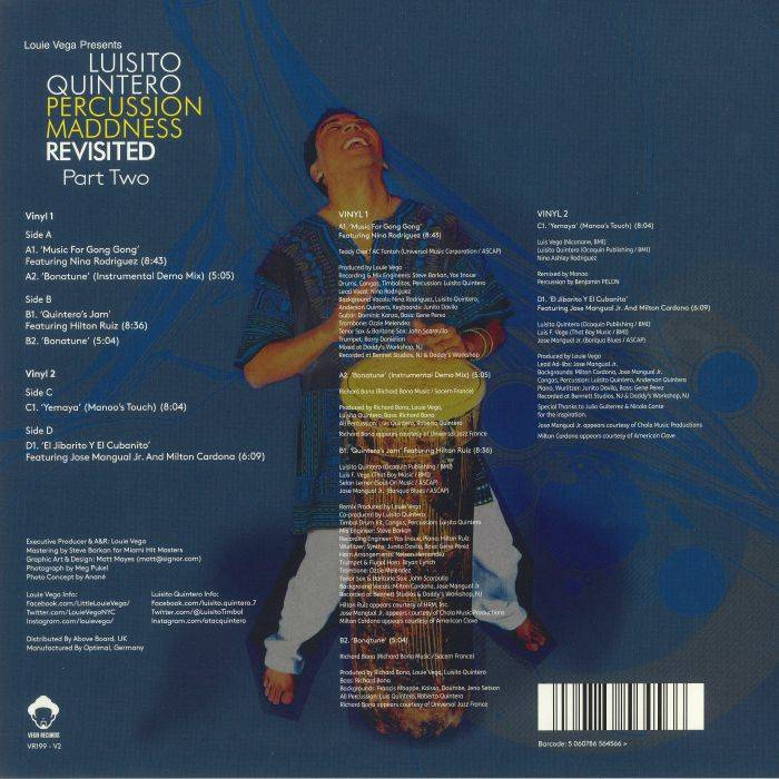 Vega Records are proud to present his new vinyl release “Percussion Maddness Revisited” Part Two. From the Osibisa remake by Luisito Quintero “Music For Gong Gong” to collaborations with the Great Richard Bona, Latin Jazz legend Hilton Ruiz and Salsa Veterans Jose Mangual and Milton Cardona, you can see the caliber of musicians that make up this timeless piece. For the afrohouse heads you have the new track “Yemaya” Featuring Nina Rodriguez remixed by Afrohouse King Manoo. Prepare for the sonic fun with vinyl pressings by Optimal !!