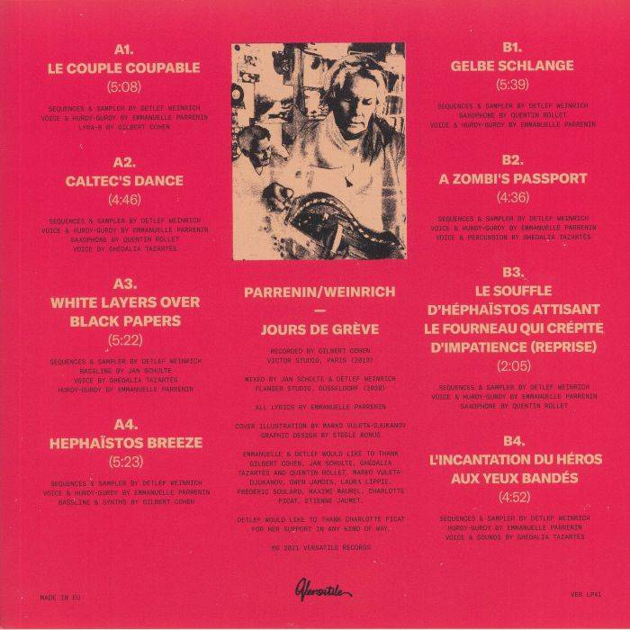 If Prometheus could have translated his fictitious epiphany into singing, it might sound like Ghédalia Tazartès’s chanting in “White Layers Over Black Paper”, one of the eight snake dance tracks-not-tracks by German producer Detlef Weinrich aka Tolouse Low Trax and French singer, hurdy-gurdy, spinet and harp player Emmanuelle Parrenin. During some days of intimate plays in Paris they created “Jours de Grève”, a bouquet of music full of mirrors, eyes, statues, secret doors, rooms, and blood. With the offhanded help by friends and like-minded souls like Versatile aura mystic Gilbert Cohen, French avant-garde saxophone player Quentin Rollet and his fellow countryman, experimental voice artist Ghédalia Tazartès, they transformed in Cohen’s studio impulsive emotions into a kind of medieval cult sound that dances with tribal dub layers in search for a higher ground.