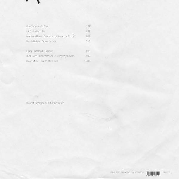 The second side slinks into motion with the deep beauty and sincere spoken word of Frank Suchland's 'Schnee', a subtle body in a cocoon of reverb which takes Sade's 'I Never Thought I'd See The Day' to another level of placidness. Melancholic Germans Die Fische met in Cairo for the first time, and 'Conversation Of Everyday Lovers' could be the theme for that great city. Underpinned by primal percussion and a restrained groove, the track twists and turns between a trio of ineffable motifs, eternal combinations to the catacombs of Abusir. From there we go sublime, soaring skywards with a ten minute triumph from Hugh Mane. Balancing concentric sequences and space age synth riffs atop an irresistible breakbeat and bubbling bassline, the British producer finds a sensuous sweet-spot between fellow Growing Bin affiliates Krakatau and Singu.