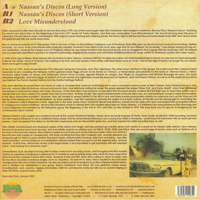 Kalita are excited to announce the first ever official reissue of Muchos Plus's highly sought-after 1979 12" reggae disco masterpiece 'Nassau's Discos'! Over forty years after initial release, and long the envy of collectors, DJs and dance music connoisseurs, the time is now right to share the music and the group's story once more. Originally privately released in a modest run on bandleader Rudy Mills' own label U-Solo Records, the single features both the long and short versions of their devastating disco take on The Beginning of the End's smash hit 'Funky Nassau', plus their own reggae funk slow jam 'Love Misunderstood'. With original copies selling for up to a500 on the second-hand market, Kalita now come to the rescue, offering a loud and remastered 12" single for all. In addition, the record is accompanied by extensive liner notes based on interviews with Rudy, and never before seen contemporary photos.