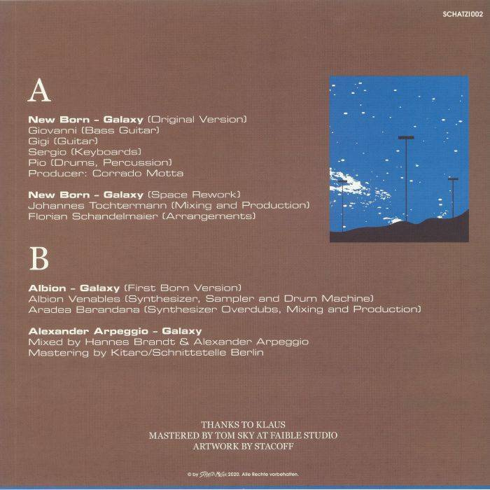New Born was made up of four Italian immigrants who all lived in the area around Ulm and Bavaria. They released this mix of proto-piano house and cosmic disco in 1981 and, typically, it became a much sought after rarity. Germany's Schatzimusik now serve up the superb single with remixes from contemporary disco dons. Original tune 'Galaxy' is a feel good, loos limbed stomper with dazzling chords and funky bass. The Space rework is more airy and rickety, then Albion offers a majestic late night lullaby while Alexander Arpeggio goes all out early Chicago house.