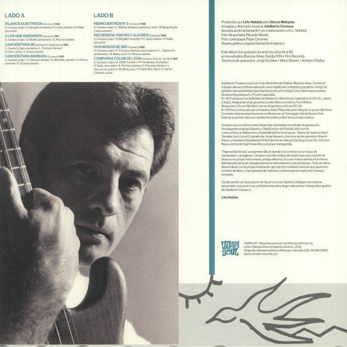 Former member of Rodolfo Alchourrón and Gato Barbieri's bands, Cevasco's first solo effort is a combination of fusion jazz with a pinch of unexpected Brazilian flavours and electronic sounds that now, more than 30 years after the original release of the album, still evoke a refreshing feel of modernity in the same vein as many other experimental Argentine and Uruguayan artists from the same era. Includes guest appearances from artists such as Litto Nebbia or Ruben Rada. Reissued on vinyl for the first time, including insert with liner notes and previously unseen photos. Details: Few musicians can boast of having played with "the greatest" without some eyebrows to be raised. The bass of Adalberto Cevasco has been heard in multiple concerts and recording sessions of artists as diverse as the Spanish divas Rocío Jurado and Isabel Pantoja, tango genius Astor Piazzolla or the cream of the Argentine jazz scene -from Pocho Lapouble, Gustavo Kerestezachi, Rubén López Furst or Andrés Boiarsky to the great Gato Barbieri- With the latter, as part of a dream band that included artists like Nana Vasconcelos as well as other Argentines such as Lapouble or Domingo Cura, he recorded two fundamental pieces in the Impulse! label catalogue in sessions held in Argentina and Los Angeles and also toured across various countries. The daily sold-out shows at the Regina Theater in Buenos Aires and their overwhelming performance at Montreux Festival are still well remembered. It is therefore out of question that Adalberto Cevasco belongs to that top-level league of musicians whose talent has also contributed to enhance those who accompany them. The history of this album begins with an encounter. Adalberto Cevasco joins Rodolfo Alchurrón's jazz-funk project Sanata y Clarificación as bassist and meets Litto Nebbia, who is invited to sing along. Some years on, when Nebbia's Melopea record company was developing, he would receive a cassette with a collection of demos recorded by Cevasco over the years. Some of the songs dated back to 1981 while others were made well into the decade and included such outstanding collaborations as that of the Uruguayan Rubén Rada, whom Adalberto Cevasco had met playing in a group of fusion candombe called Candonga. In addition to producing the complete album, Nebbia would also collaborate in a special way in one of the most outstanding tracks (Reencuentros Nº2) by adding to Cevasco's fusion jazz some unexpected Brazilian flavours and electronic sounds that now, more than 30 years after the original release of the album, they still evoke a refreshing feel of modernity. As the Argentine press of the moment highlighted, it'd seem as if the influences received and developed by the bassist during his career as a freelance musician - from post-Piazzolla tango to proyección folclórica (a movement of revision and modernization of the Argentinian musical roots) - had been added to their superb rhythmic work in this album. "Pájaros Eléctricos" was never presented live and has remained as the only published work by Cevasco as a soloist since the date of its release.