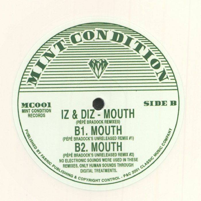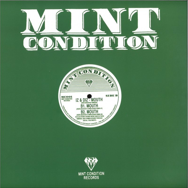 Mint Condition - A brand new record label focussed on excavating the outer fringes of classic House and Techno. Unreleased mixes, classics and overlooked gems mined from the last 20+ of contemporary dance music are the order of the day. From Chicago, Detroit and New York to London and beyond, Mint Condition have got their expert digging hats on to bring you exclusive heat and those rarer than rare jams that have been on your wants list for years! Dig in…. Iz & Diz’s “Mouth” - Originally released on the seminal Chicago/London label Classic recordings way back in 2002 is a bonafide benchmark of modern House music, on it’s release the records original flavour was a welcome breath of fresh air (pun intended!). By signing up the French genius Pepe Bradock on remix duties Classic had on their hands a future anthem. Bradock’s singular, fresh production style pushed the track into the imaginations of numerous DJ’s and ensured the track would find it’s place in the bags and mixes of heads for years to come. Still sounding totally alien today with it’s mix of human sounds twisted through digital treatments, Mint Condition are extremely proud to unleash these cult remixes backed with the unheard, unreleased versions and takes from the Pepe Bradock remix sessions for their debut release. Across 3 tracks we get to sample the wigged out funk from the deepest recesses of Pepe’s mind, his chopped up vocal samples and intricate percussive elements coming off sounding like Todd Edwards on acid and still sound completely new/insane today.