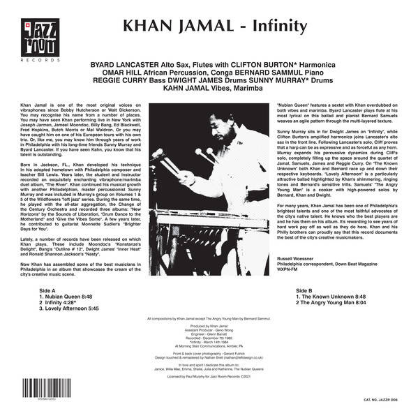 Vibe's Maestro Khan Jamal's "Infinity" features a Stellar line up, a drums and percussion-rich sextet that includes Legends Byard Lancaster and Sunny Murray amongst others. The music stands up to anything released on the great Jazz labels like Blue Note, Prestige, Verve or Impulse.