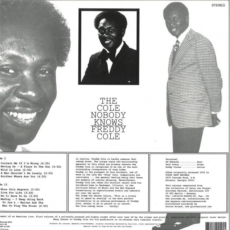 Freddy Cole's 'The Cole Nobody Knows' is available as digipack-CD & limited vinyl-LP / Holy Grail soul jazz album by Freddy Cole, singer, pianist, Nat 'King' Cole's youngest brother and uncle of Natalie. Privately pressed LP recorded 1976 in Atlanta, including famous version of 'Brother Where Are You' and nine more excellent rare groove tracks, most of them suitable for the jazz dance scene. Outstanding quartet takes throughout with stunning jazz ballad performances of 'Live For Life' and 'Miss Otis Regrets', jazz dance pearls 'Wild Is Love', 'Moving On - Place In The Sun' plus rough blues tracks like 'A Man Shouldn't Be Lonely' and 'Waiter Ask The Man To Play The Blues'. First 1:1 reissue of an extremely rare and highly sought after vinyl LP on the small imprint 'First Shot' from Georgia, remastered and with original first press cover art. Sonorama is proud to release a legendary and sought after soul jazz LP that will send shivers down your spine. 77-year-old singer & pianist Freddy Cole, youngest brother of Nat 'King' Cole and uncle of Natalie Cole, is a truly unique interpreter with an impressive career from 1952 until 2010. This very rare and privately pressed LP was recorded back in 1976 and finally gets its first remastered 1:1 reissue with original cover artwork (First Shot label), including such greats as 'Wild Is Love', 'Brother Where Are You' and 'Live For Life'. The original press album is highly sought after all over the world and fetches ridiculous prices at auctions. Even another LP release of the same set of recordings with different cover art, pressed 1977 on the Audiophile label, is nearly impossible to find today. 'Freddy Cole has had a great career, wether or not you've ever heard of him' (Pittsburgh Post-Gazette 2006) and he is still going strong: His quartet is currently touring the U.S., Switzerland, Germany or Lebanon and will come back to Europe for more shows in May 2010. Check 'freddycole' to find out about the man who 'just might be the most attractively understated jazz singer currently at work' (The Chicago Sunday Times 2000).