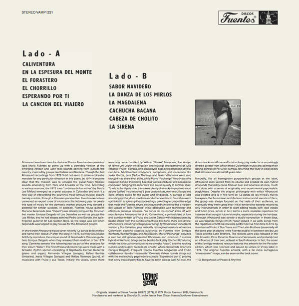 Colombian outfit Afrosound were a reaction to the early 1970?s Chicha movement, happening in Peru and Bolivia at the time. Jose Maria Fuentes saw the popularity of this new type of hybrid sound which resulted in this super group. They incorporated the Andean guitar sound with funk, salsa/son, tropical, disco and Afro Colombian rhythms - the result being cumbia party albums from start to finish. Their debut album La Danza De Los Mirlos receives a much deserved reissue here on Vampi Soul, the sister label of the more well known Munster Records out of Madrid.