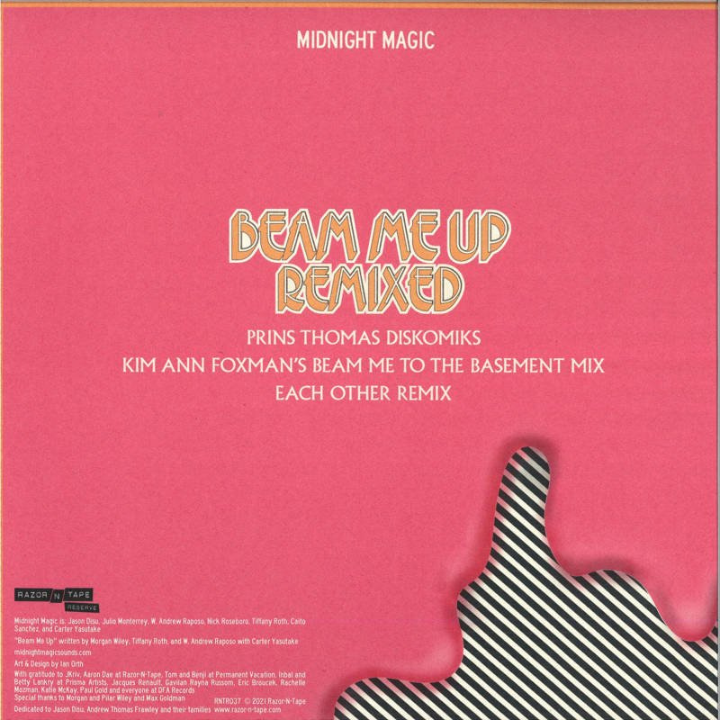 A decade ago, New York band Midnight Magic delivered arguably THE greatest disco anthem of the 21st century, the sing-along classic that is 'Beam Me Up'. Fittingly, Razor 'N' Tape has decided to mark the record's anniversary by delivering a trio of fresh remixes. Prins Thomas' A-side remix is the most faithful to the original, though it also boasts his usual dubbed-out effects, loose and heavy disco percussion and some wriggly acid lines amongst the disco bass, melancholic horn blasts and now-familiar vocals. Over on side B, Kim-Ann Foxman re-imagines the cut as a sleazy, mid-tempo acid disco chugger and Each Other re-frames it as a surging, arpeggio-driven dance through Italo-disco pastures. Ace!