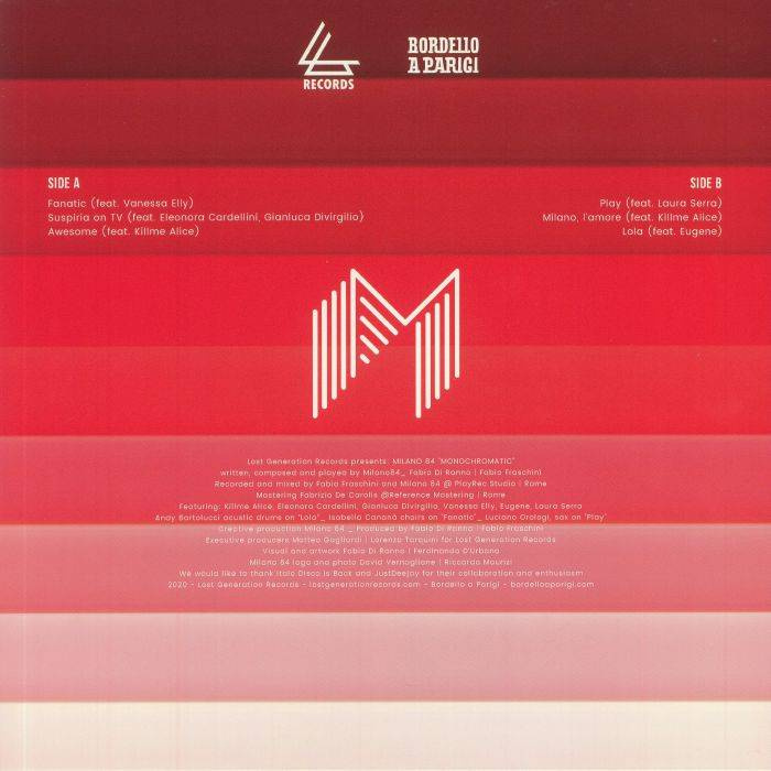 The six songs of this 12” define style and influences: “Milano, l’amore” is the song that all fans of the 80s did not know they wanted: romantic, elegant but with sweaty bpm. “Fanatic” is a modern classic, which takes the Italo disco and transports it into the future. New wave echoes characterize “Suspiria on TV”, “Awesome” lights up the sound of Milano 84 with sunny colors, “Play” flirts with the elegant italian synthpop and cinematic suggestions. “Lola”, finally, is a homage to Krisma and to the sign that their music and their creativity has left: a hit revived with love and new sounds that closes “Monochromatic”, quality songs for italopop hearts.