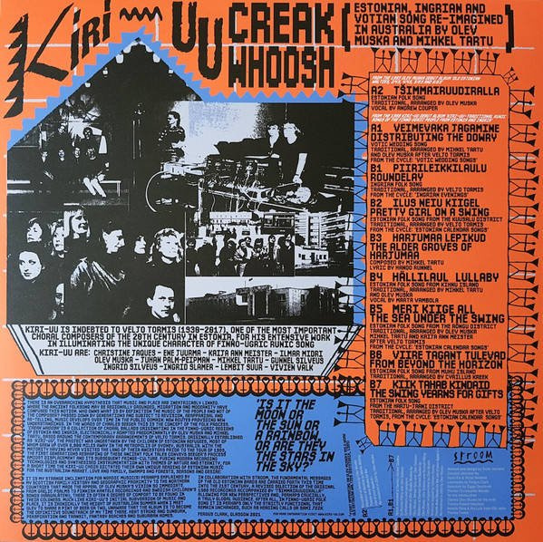 ‘Creak Whoosh’ is a collection of choral ballads originating in the Finno-Ugric regions of Estonia and Ingria, electronically adapted predominantly by Olev Muska and Mihkel Tartu, based around the contemporary arrangements of Veljo Tormis.