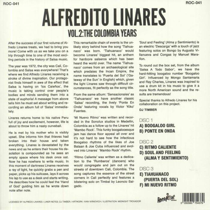 Last year Rocafort Records delivered a rather good retrospective of the early works of Peruvian band-leader Alfredito Linares, an unheralded star of Latin jazz and later salsa and boogaloo who made some seriously good music in the late 1960s and '70s. This sequel, which features six scintillating tracks stretched across three seven-inch singles, tells the next chapter of the story, following Linares' relocation to Cali, Colombia in the early '70s. What's an offer is a heavy, club-ready mixture of righteous boogaloo - all infectious grooves, loose-limbed South American percussion, breathless group vocals and rising, big band style horns - and breezy salsa workouts, all of which hits the spot and then some.