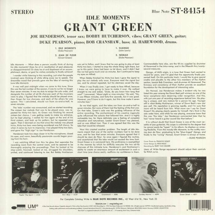 Time and troubles seem to melt away during the fifteen enrapturing minutes of “Idle Moments,” the opening track of Grant Green’s sublime 1963 album of the same name. As the piece unhurriedly unfurls all the unique colours of the ensemble present themselves with Green’s soulful guitar joined by Duke Pearson’s elegant piano, Bobby Hutcherson’s crystalline vibraphone, Bob Cranshaw’s reassuring upright bass, Al Harewood’s subtle drums, and Joe Henderson’s magnificent tenor saxophone. The pace quickens for the rest of this tremendous set including the nimble Green original “Jean de Fleur,” a bluesy take on John Lewis’ MJQ standard “Django,” and a driving performance of Pearson’s original “Nomad.” This Blue Note Classic Vinyl Edition is all-analog, mastered by Kevin Gray from the original master tapes, and pressed on 180g vinyl at Optimal.