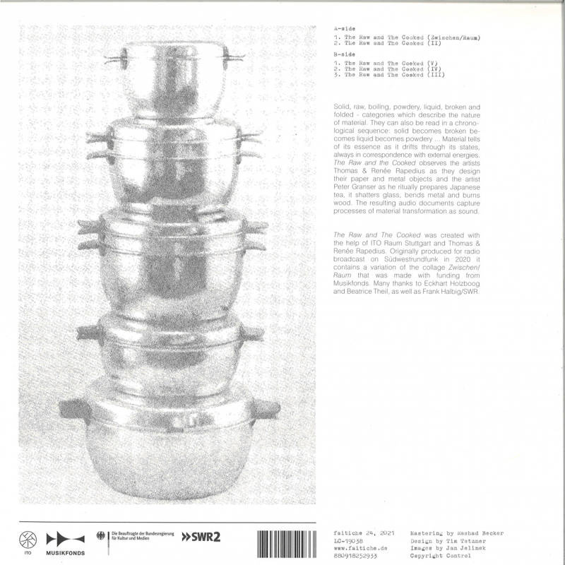 The Raw and The Cooked was created with the help of ITO Raum Stuttgart and Thomas & Renée Rapedius. Originally produced for radio broadcast on Südwestrundfunk in 2020 it contains a variation of the collage Zwischen/Raum that was made with funding from Musikfonds. Many thanks to Eckhart Holzboog and Beatrice Theil, as well as Frank Halbig/SWR.