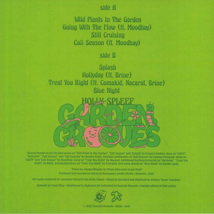 Milan's Funclab are back with the debut album from Leonardo Passanti aka HollySpleef, a 28 year old producer (and skater and gardener) from Emilia-Romagna, Italy. The eight tracks featured on Garden Grooves take in a wide selection of moods and, well.. grooves. Improvisational jazz fuses with ambient, hip- hop, house and dub. From the blunted summertime urban bliss of 'Going With The Flow' featuring vocals by Moodhay, as well as the glitch-hop of 'Splash', to the emotive late night deep house of 'Hollyday' and the sensual bass music of 'Treat You Right' - it's best enjoyed in you lawnchair.