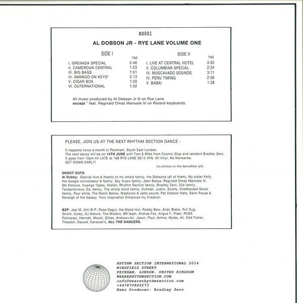 With just a few low-key releases behind him, you'd be forgiven for not being familiar with the work of South London beatmaker Al Dobson Jnr. Such a situation will undoubtedly soon change with Dobson Jnr primed to release album length projects on IZWID and Rhythm Section International, two fledgling labels associated with respected selectors. Before Sounds from the Village Vol.1 drops on the former (overseen by KUTMAH) the man called Al inaugurates the latter label, an extension of the Rhythm Section club night hosted by Boiler Room's Bradley Zero. Despite his status as a South London celebrity, Zero is a steadfast supporter of his local roots and the vinyl format so it's great to see him offering Dobson Jnr the platform to shine. And shine he does on Rye Lane Vol 1, a wonderful 11 track collection that is comparable in execution and mood to Mo Kolour's sublime debut.