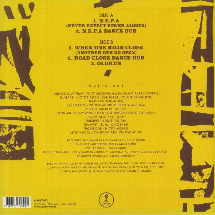 In 1979, Tony Allen decided to leave Fela Kuti & Africa 70 and moved to London in 1982. Originally Released in 1984 on Earthworks Records, this reissue holds an extra track previously unreleased on vinyl called “Olokun”. N.E.P.A (Never Expect Power Always) is a searing critique of the Nigerian Electric Power Authority, an organisation that governed the use of electricity in Nigeria.