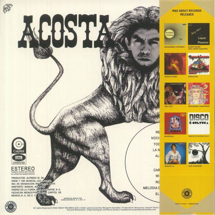 For this last LP, entitled “Acosta” but known as "El Leon”, all the compositions are originals, unlike his previous albums where the labels required him to record at least 6 songs that were hits on the popularity charts.