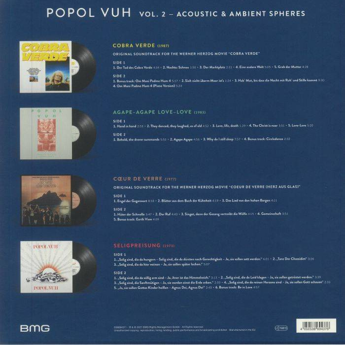 Czteropłytowy box "Vol. 2 - Acoustic & Ambient Spheres" zawiera cztery ważne, akustyczno-ambientowe albumy Popol Vuh z lat 70. i 80., czyli "Seligpreisung", "Coeur de Verre", "Agape-Agape" i "Cobra Verde". Ostatnie z dzieł stanowiło oficjalny soundtrack do kultowego filmu Wernera Herzoga. Wszystkie płyty zostały na nowo zremasterowane oraz wytłoczone na 180-gramowych audiofilskich winylach. Wydawnictwa zawierają oryginalne okładki oraz bonusowe nagrania. Całości towarzyszą książeczki z obszernymi komentarzami i zdjęciami, a także trzy grafiki oraz kolekcjonerskie plakaty do filmów "Szklane serce" i "Cobra Verde" w formacie A3.