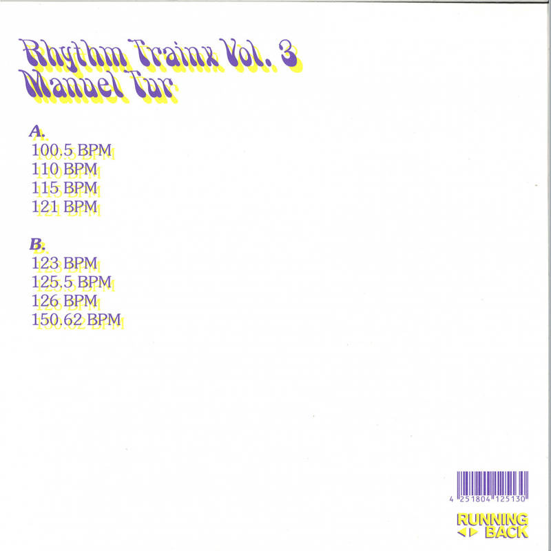 Drums, please! Fortunately, Manuel Tur has plenty of them. The well-versed producer is no stranger to Running Back and a most-welcome returnee. Following the box-office success of 121 BPM on the very first Rhythm Trainx edition in 2015 – not to be confused with 121 BPM (1) on here – Tur prepared a whole collection of beating, driving, percussive, pulsating, fast and slow DJ tools, rhythmic repetitions and acrobatic adventures. A dozen tracks (including digital exclusives) Ranging from 100 to 150 Bpm, you get it all and then some: from tribal trace elements to Windy City patterns, New York house fabrics, robotic funk and some of techno’s DNA. Saves the (last) night of any DJ and your next mixtape.