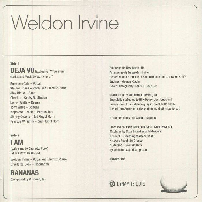 Weldon Johnathan Irvine is enjoying a return to the spot light this month as Dynamite Cuts serve up a trio of reissues of some of his best work. He recorded it all during the 80s, when the British funk, soul and jazz scene was at its most vibrant best and this is a fine expand of that. As always with this famously relaxed and easy going artist work, the music reflects his warm spirit in sound. This limited 45rpm opens with a special 7" cut of 'Deja Vu' which is mellifluous and glowing thanks to the molten Rhodes chords. On the flip is 'I Am' and then 'Bananas' gets you shaking your limbs with its off-grid beats and busy chord work.