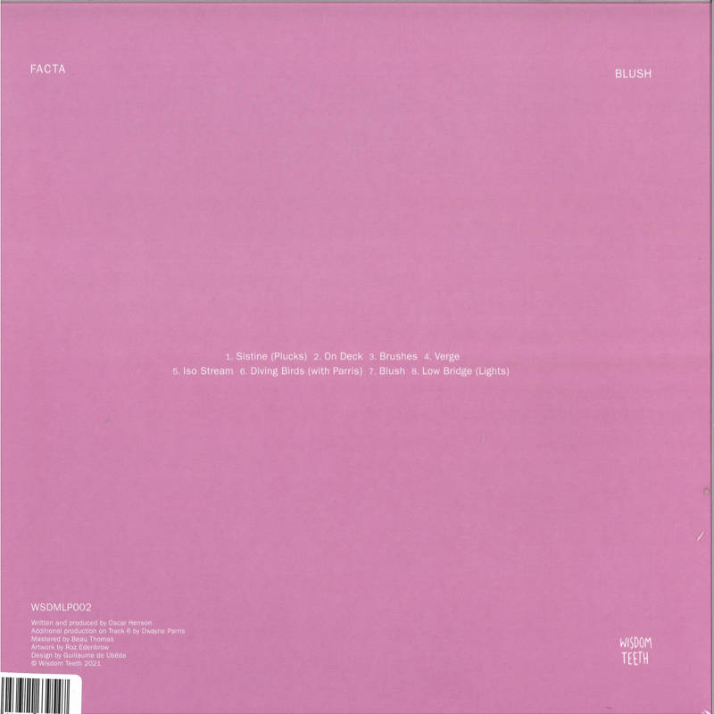 London-based record label Wisdom Teeth kicks off 2021 with something close to home: Blush - the playful, dynamic debut LP by label co-founder, Facta. Recorded unusually quickly over a short stint in early 2020, the record is the product of a period of refreshed and unfussy creativity. It’s an innovative and distinctly contemporary album that moves a good few steps beyond the artist’s work to date - loosely rooted in UK dance music but taking added influence from ambient, modern classical, dreampop, Balearic, folk music and beyond. The result is a lush, ornate record populated by aqueous pads, bleeping arps, wandering melodies and sparse broken rhythms; acoustic instruments that play out alongside FM synths, all processed with a pristine UV sheen inherited from modern pop music. The record opens with ‘Sistine (Plucks)’ - a crystalline synth piece with a stumbling, shifting metre revolving around an odd-ended MIDI harp loop, coloured through with washed-out pads and snatches of found sound. This breezy mood follows through to ‘On Deck’, where an FM vibraphone rings out on top of woozy, warping chords and a subby soca groove. Moving forward the record moves cohesively through a range of shifting moods and hues. The machine jazz of ‘Brushes’ is tense and coiled, with nods towards Burnt Friedman, Photek and Eli Keszler. ‘Iso Stream’ sees a rich, colourful sprawl of arpeggiated synths and dissociated vocal chops unspool slowly to form pooling, lowlit melodies. Title track ‘Blush’ is a forlorn Autonomic love song built from clicks-n-cuts - like dBridge & Instra:mental reduced and reinterpreted by SND. Throughout, bold, broad melodies take centre stage, and the tracks build like compositions rather than loops or club tools. There are echoes of the dancefloor - particularly in the slo-mo bruk of ‘Verge’ and the glacial subs underpinning ‘Diving Birds’ (a collaboration with friend and Trilogy Tapes regular Parris) - however the end results find us somewhere far off. ‘Blush’ is the second long-form release to come from Wisdom Teeth following K-LONE’s 2020 debut album, ‘Cape Cira’, which was widely ranked as one the best LPs of 2020.