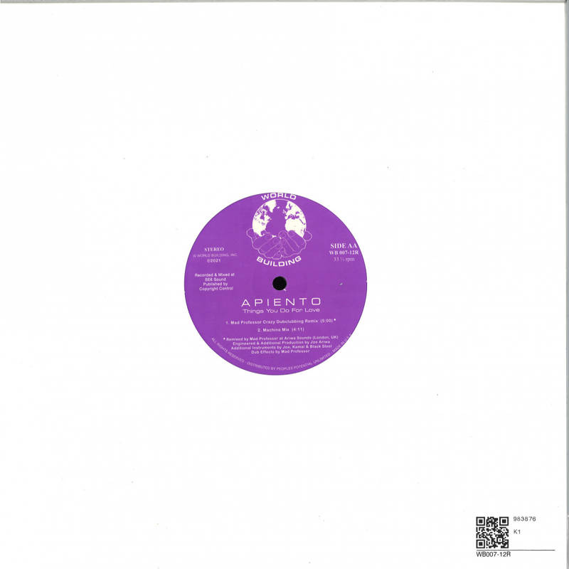 12 inch reissue of Apiento's chill-out anthem "Things You Do For Love" with a new remix by dub reggae legend Mad Professor! Also features the "Original Mix" & "Heartbeat" mixes from the original 7 inch release. Plus the "Machine Mix" previously only available digitally. Go big or go home, right?!?!