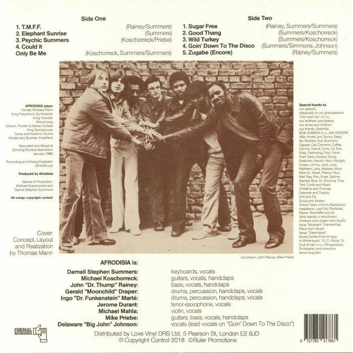 Later this year, crate-digging specialists Cordial Recordings is set to release an album of previously unheard recordings by cult German jazz-fusion combo Afrodisia. To get us in the mood, the London-based label has decided to reissue the band;s sole previous album, 1980's Elephant Sunrise. While the album is best known for the impeccable jazz-funk sweetness of "Sugar Free" - recorded, like much of the rest of the album, by a mixture of locals and guest musicians from a nearby U.S army base - there's much to enjoy throughout, from the psychedelic heaviness of opener "TMFF" and elastic dancefloor workout "Psychic Summers", to the slap-bass-propelled funk-rock of "Wild Turkey" and intense, full-throttle closer "Zugabe (Encore)"