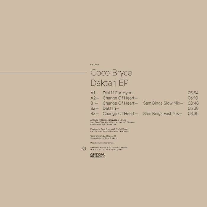 Coco Bryce makes a very welcome return to the label. Taking us on a journey of jungle drums and break-beat sonics, accompanied by some slow & fast remixes from the Bristol dwelling Sam Binga.