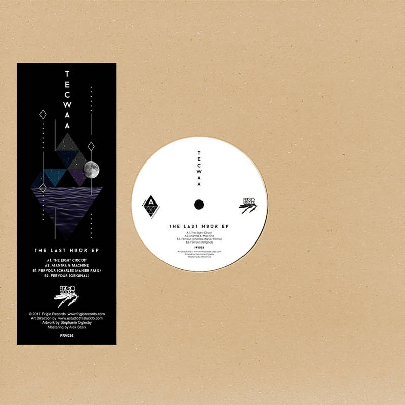 Tecwaa is the solo project of York based producer Paul Fawcett, a musician who discovered his sound in the North England techno scene and went on to nurture it with movie scores, Detroit techno and homegrown electronica. His debut brings together three pieces of original machine music alongside a very special remix. The menacing “The Eighth Circuit” broods into being. Looming synthwork is further darkened by distant vocals, house percussion keeping time in this sinister opener. “Mantra & Machine” has similar attributes. Adopting clean rhythms, the track refuses to sit comfortably in any genre pigeonhole as Tecwaa weaves a work of cerebral depth. Charles Manier introduces the flip with his take on “Fervour”, Tadd Mullinix returning to Frigio for the first time since his superb remix as JTC of Juanpablo’s “Dream” in 2010. A funk laden work of hip hop breaks and industrial distortion where Manier explores blackened moods and horrorshow grooves. The original of “Fervour” closes, showing another side of Fawcett’s style, BPMs drop as foundations are laid bare in this stark conclusion.